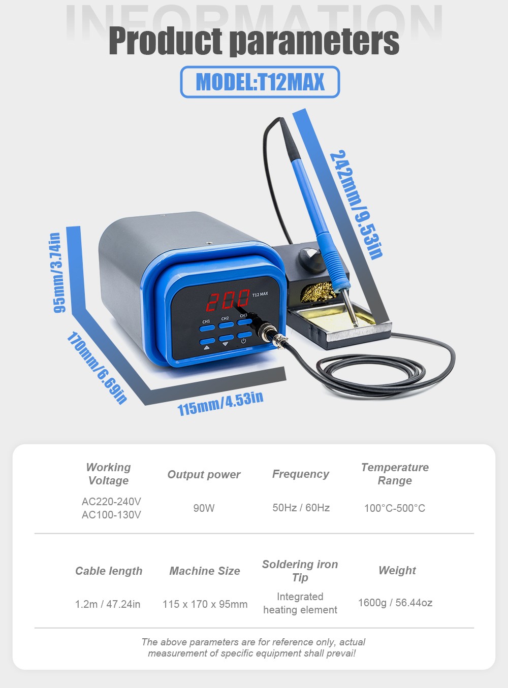 Voltage:100-130V/220-240VPower:90WTemperatuer:100-500℃